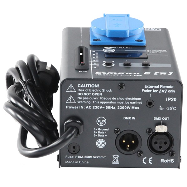 – 1 canal DMX512 – Potentiomètre de contrôle intégré (HTP) – Télécommande externe – Mode Relais Statique – Limitation de niveau de sortie – Afficheur à Leds 3 digits – Entrée et Sortie DMX sur embases XLR 3 broches – Sortie graduée sur embase PC16A – Refroidissement par convection naturelle – Platine de fixation intégrée