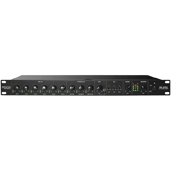 Le DN-312X est un mélangeur 12 canaux rackable au format 1U avec 6 entrées Mic/Ligne combo XLR/Jack avec préamplis HDHQ ™. Il dispose de sorties symétriques XLR, d’une sortie mono au format jack 6,35mm qui peut être utilisé pour connecter le DN-312X à un mélangeur, une paire de sorties stéréo RCA pour se connecter à un dispositif d’enregistrement, et un port monitoring Mic au format jack 6,35mm qui peut être utilisé pour surveiller les signaux des micros. Le DN-312X offre un contrôle de niveau individuel pour toutes les entrées en plus d’un contrôle de niveau séparé pour la sortie mono et le Master. Il dispose d’un égaliseur 3 bandes et d’un contrôle de priorité pour le canal Mic/Ligne 1.